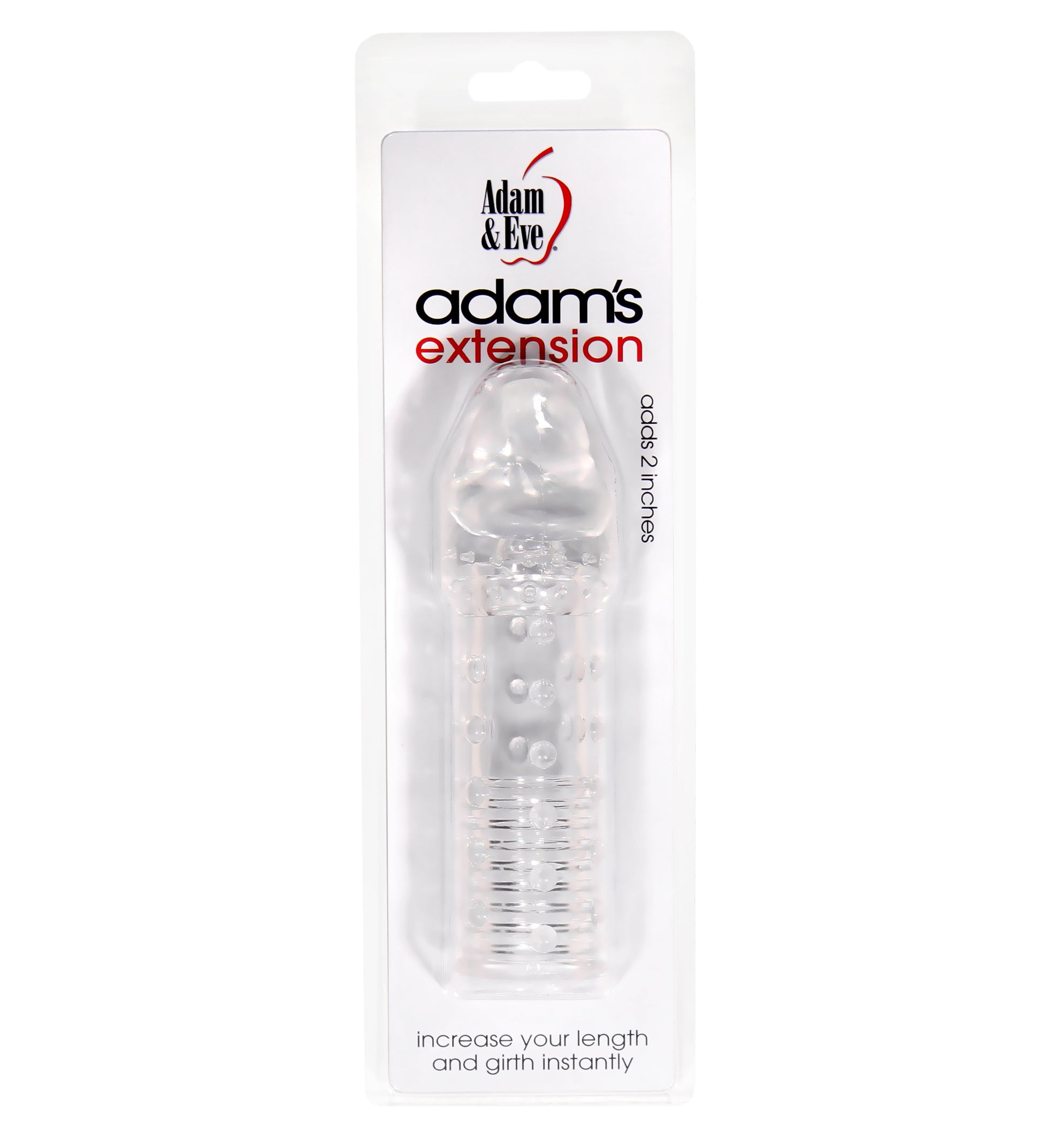 Adam and Eve line Adam's Penis Extension features 6 inches long by 1.5 inches wide penis enhancing sleeve. Adds 2 inches of length plus girth. Made from body-safe, phthalate-free soft and stretchy clear jelly Thermoplastic Rubber TPR materials. Realistic shape for the ultimate ecstasy. Pleasure points inside and out. Securely fits the most sizes of penis or plastic slimline vibrator. Clear so you can watch all the action.