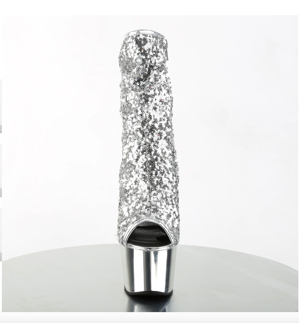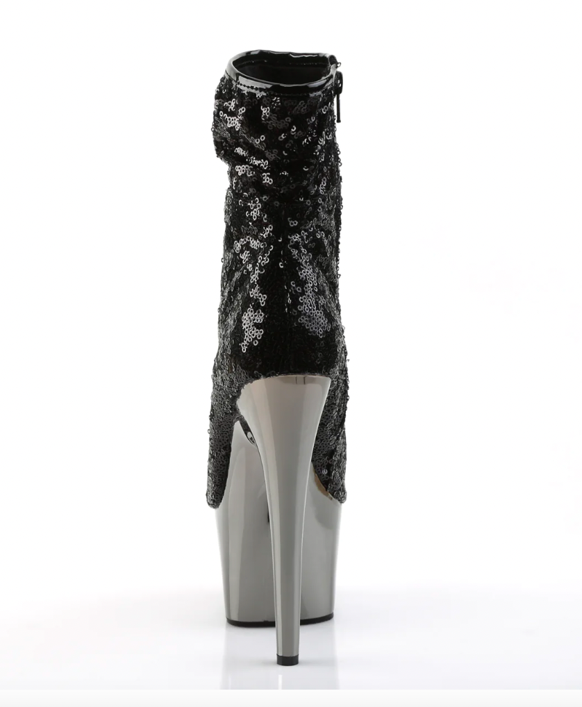 7" (17.8cm) Stiletto Heel, 2 3/4" (7cm) Chrome Plated Platform Peep Toe Ruched Shaft Ankle Boot, Inside Zip Closure