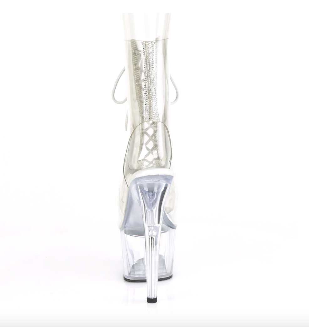 7" (178mm) Heel, 2 3/4" (70mm) Platform Open Toe/Heel Lace-Up Front Ankle Boot w/Rhinestone Embellishment Along Front Panels & Back