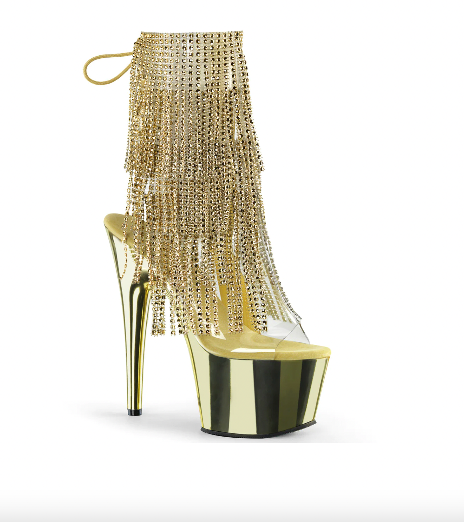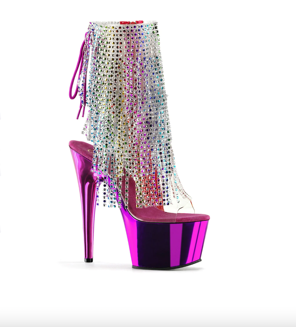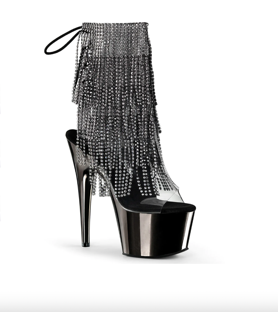 7" (17.8cm) Stiletto Heel, 2 3/4" (7cm) Chrome Plated Platform Open Toe/Stiletto Heel Back Lace-Up Ankle Boot Featuring 4-Layer Chrome Plated, Simulated Rhinestone Fringe, Inside Zip Closure