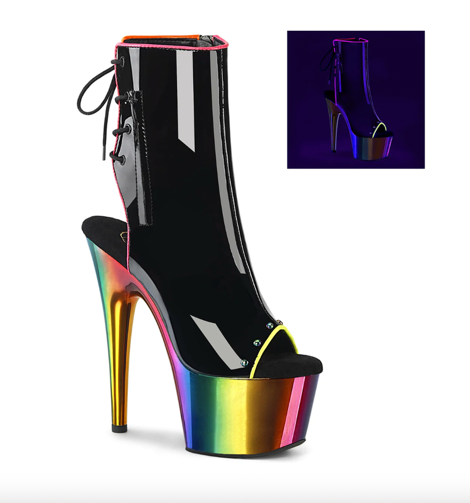 7" (178mm) Heel, 2 3/4" (70mm) Platform Open Toe/Heel Lace-Up Back Ankle Boot Featuring Blacklight Reactive Piping and Rainbow Chrome Plated Zipper, Studding at Toe Opening & Entire Platform Bottom,