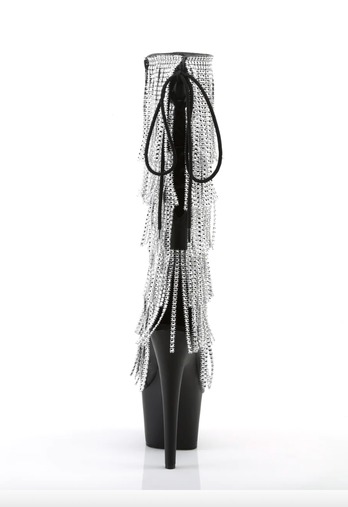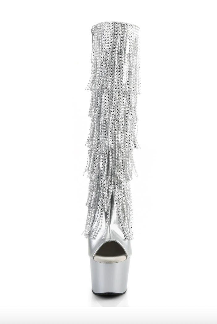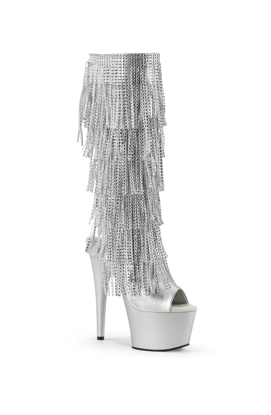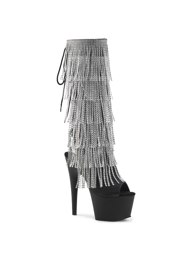 7" (17.8cm) Stiletto Heel, 2 3/4" (7cm) Platform Open Toe/Stiletto Heel Lace-Up Knee High Boot Featuring 6-Layer Simulated Rhinestone Fringe, Inside Zip Closure