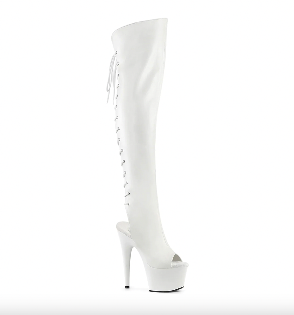 Make a statement with the Adore-3019, the ultimate over-the-knee boot. Featuring a towering 7" stiletto heel and 2 3/4" platform. The open toe and back lace-up design add a touch of elegance and sexiness. With a full-length inner side zip closure, these boots are easy to slip on and off, making them perfect for a night out on the town. Whether you're dressing up or down, the Adore-3019 is the ultimate accessory for anyone looking to make a bold statement.