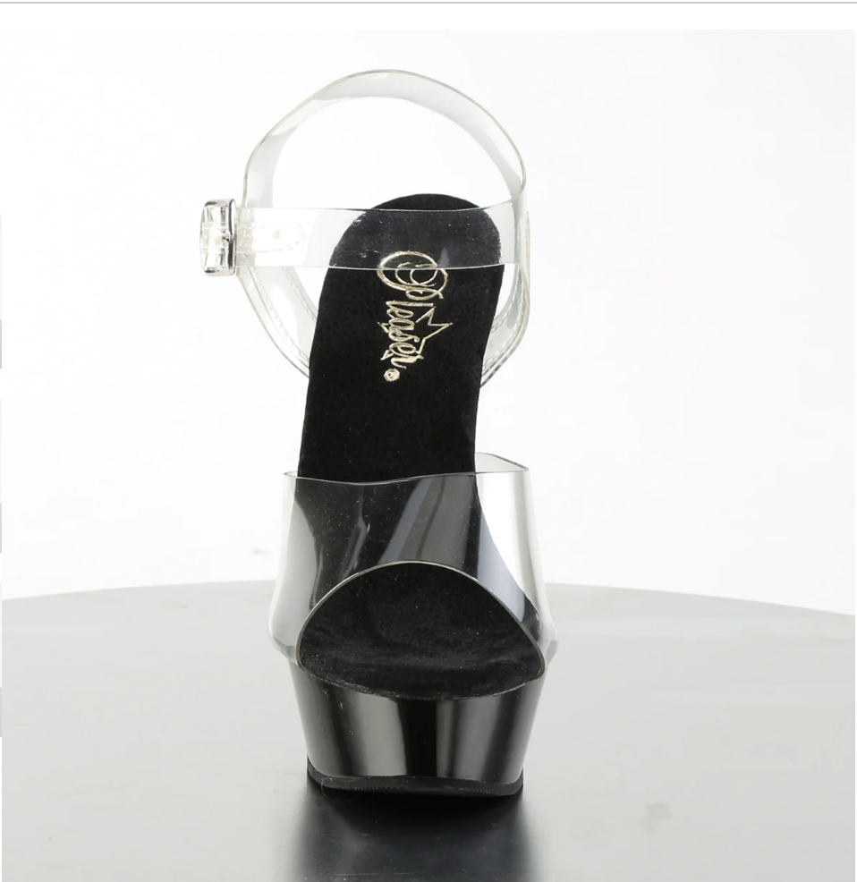 5 1/2" (14cm) Heel, 1 1/2" (3.8cm) Ankle Strap Sandal Featuring Chrome Heel and Jewel Accent