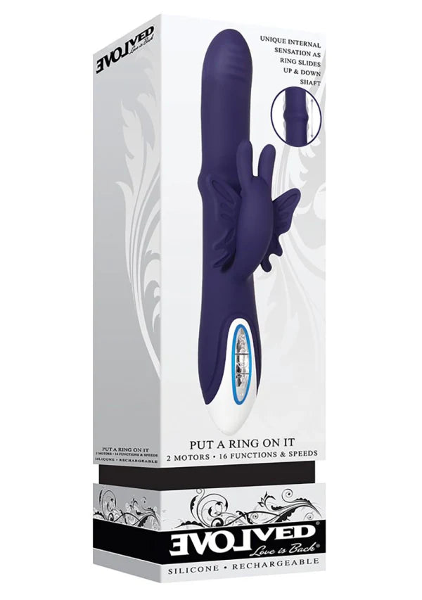 This playful vibe has an unusual feature that really gives woman something to sing about! Aside from its girthy, lengthy size and widespread butterfly clitoral stimulator, this hard-working device boasts s ring that slides up and down the shaft in five different speeds! Woman describe the internal sensation as a positively exhilarating as the ring moves seamlessly underneath the creamy silicone from the bottom of the shaft up to just under the head. Meanwhile the butterfly shaped stimulator spans wide to energize far-reaching clitoral nerves for indirect stimulation that creates a deeply satisfying climax. Experience the sliding ring vibe underwater since this toy is completely subversive, and clean up is easy with Evolved Toy Cleaner and a warm water rinse.