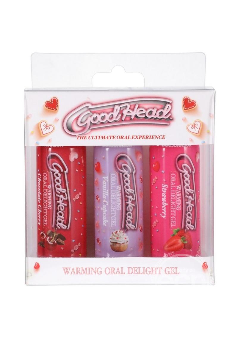 GoodHead makes oral better for both the giver and receiver. This pack of Warming Oral Delight Gel includes Strawberry, Vanilla Cupcake, and Chocolate Cherry.
