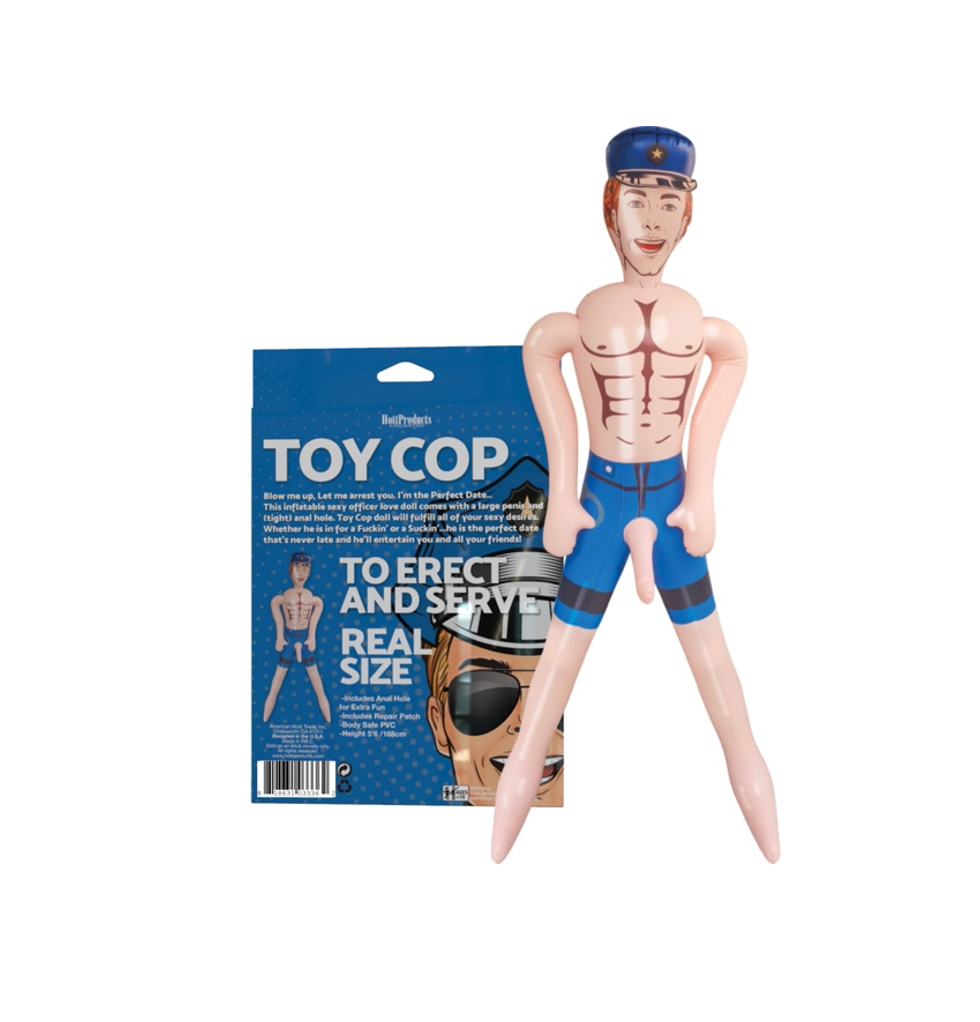 Toy Cop Inflatable Party Doll from Hott Products Unlimited. To erect and serve. Blow me up. Let me arrest you. I am the perfect date. This inflatable sexy officer love doll comes with a large penis and tight anal hole. Toy Cop male love doll will fulfill all of your sexy desires. Whether he is in for a fucking or a sucking, he is the perfect date that is never late and he will entertain you and all your friends! Features: includes inflatable male doll. Includes anal hole. Includes a repair patch. Made using body safe PVC. Height 5 feet, 6 inches.