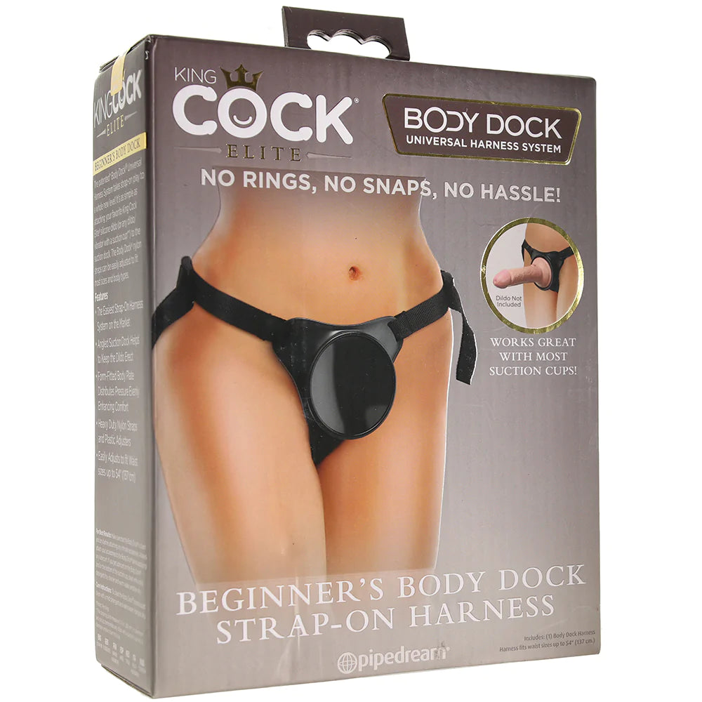 The patented King Cock Elite Beginner's Body Dock® Strap-On Harness takes strap-on play to a whole new level! It's as simple as attaching your favorite King Cock Elite® silicone dildo (or any dildo/vibrator with a suction cup*) to the suction dock. The Body Dock® nylon straps can be easily adjusted to fit most sizes and body types.