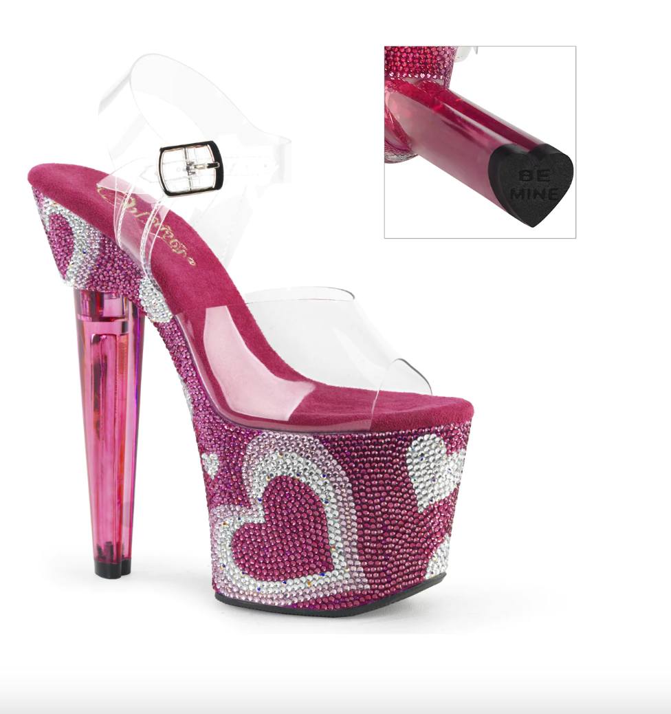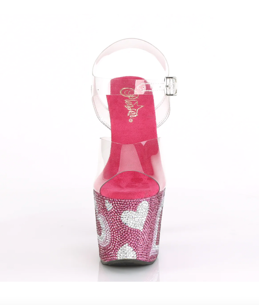 7" (178mm) Heart Shaped Heel, 3 1/4" (83mm) Platform Ankle Strap Sandal w/ Tinted Heel & Rhinestone Embellished Platform Bottom Featuring Contrast Color Hearts