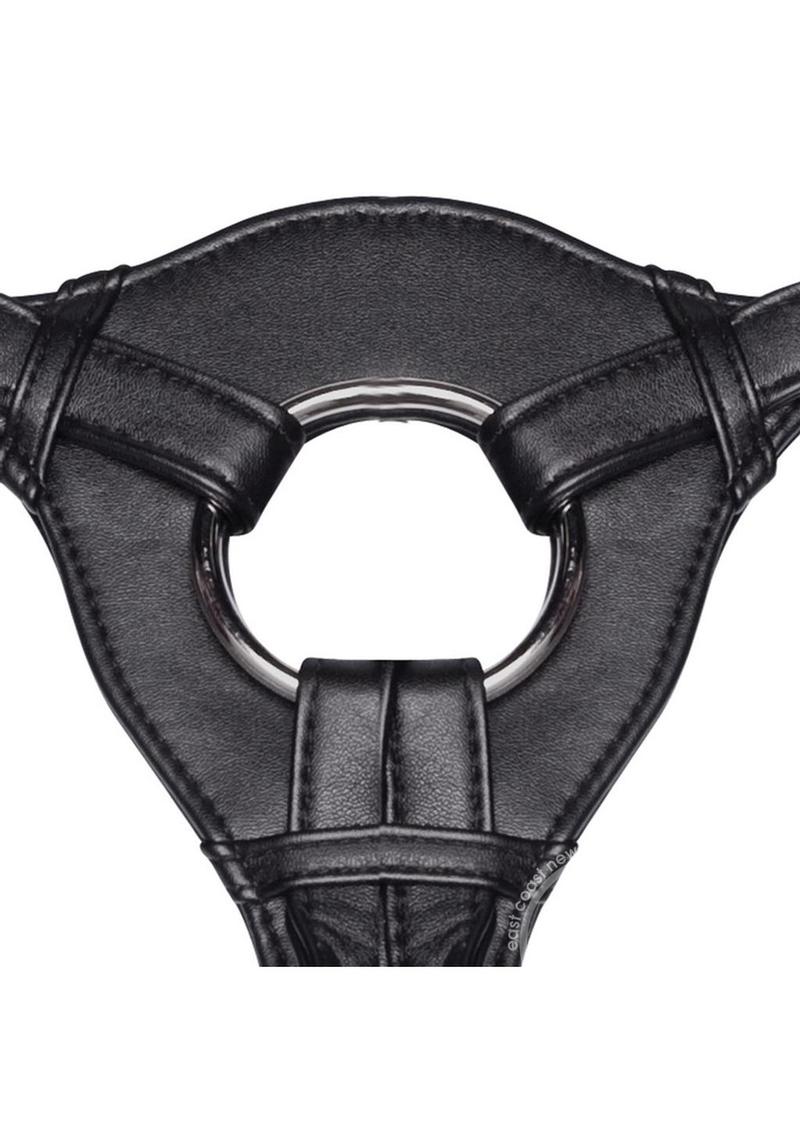 Get deep with the Lux Fetish Patent Leather Strap-on Harness. This sexy, supple leather harness can accommodate any dildo with a flared base, and includes 2 rubber holder rings. Perfect for new initiates just discovering the joys of deep penetration, or for experts looking to add another tool to their arsenal. 4-way adjustable straps fit hips up to 60".