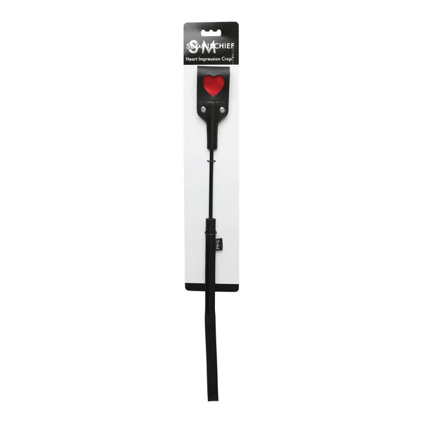 This vinyl and pleather crop features a heart cut-out end with a sturdy black wand and wrist strap.