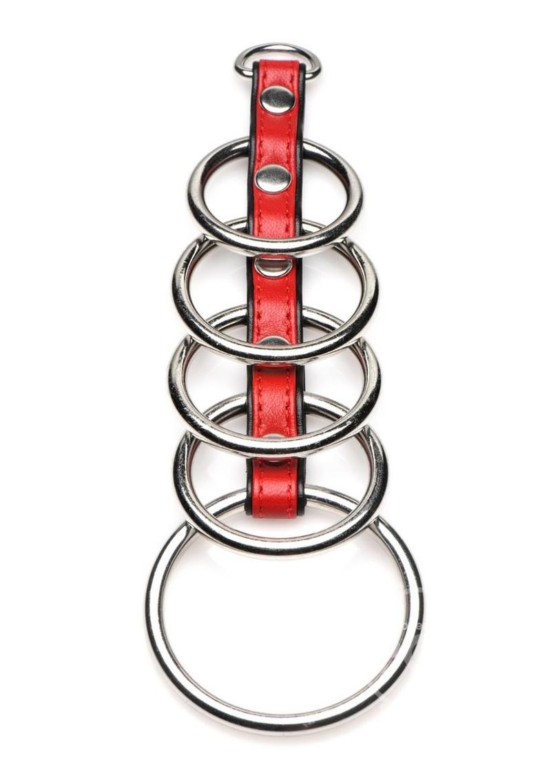 Wear a cock ring with graduated rings that look like a reinforced metal spine for your shaft. With an edgy style that both looks and feels unforgettable, enjoy how each metal ring squeezes and restricts your hard rod. The largest ring slips over the shaft and both balls to create a firm and snug constriction ring around the shaft. The rest circle the shaft with slightly smaller rings. The end D-ring is perfect for attaching a leash to if you wish to be led around.