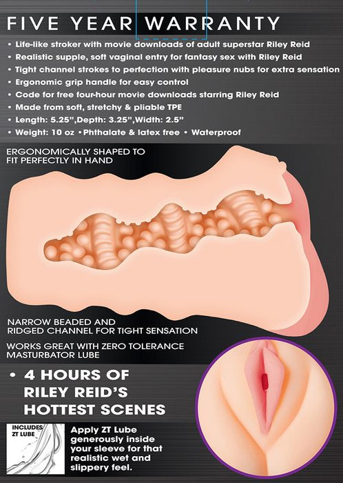 Vagina Stroker Riley Reid from Zero Tolerance Toys. Life like stroker with movie downloads of adult superstar Riley Reid. Realistic supple, soft vaginal entry for fantasy sex with Riley. Tight channel strokes to perfection with pleasure nubs for extra sensation. Ergonomic grip handle for easy control. Code for free four-hour movie downloads starring Riley Reid. Made from soft, stretchy, and pliable Thermoplastic Elastomers TPE. Length 5.25 inches, depth 3.25 inches, width 2.5 inches. Weight 10 ounces. Made using body safe phthalate free and latex-free materials.